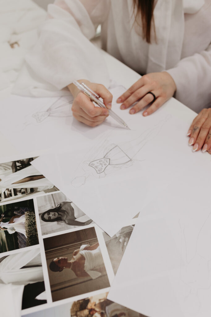 Damos forma al destino. Entre telas, bocetos y pruebas, tu vestido empieza a tomar vida.